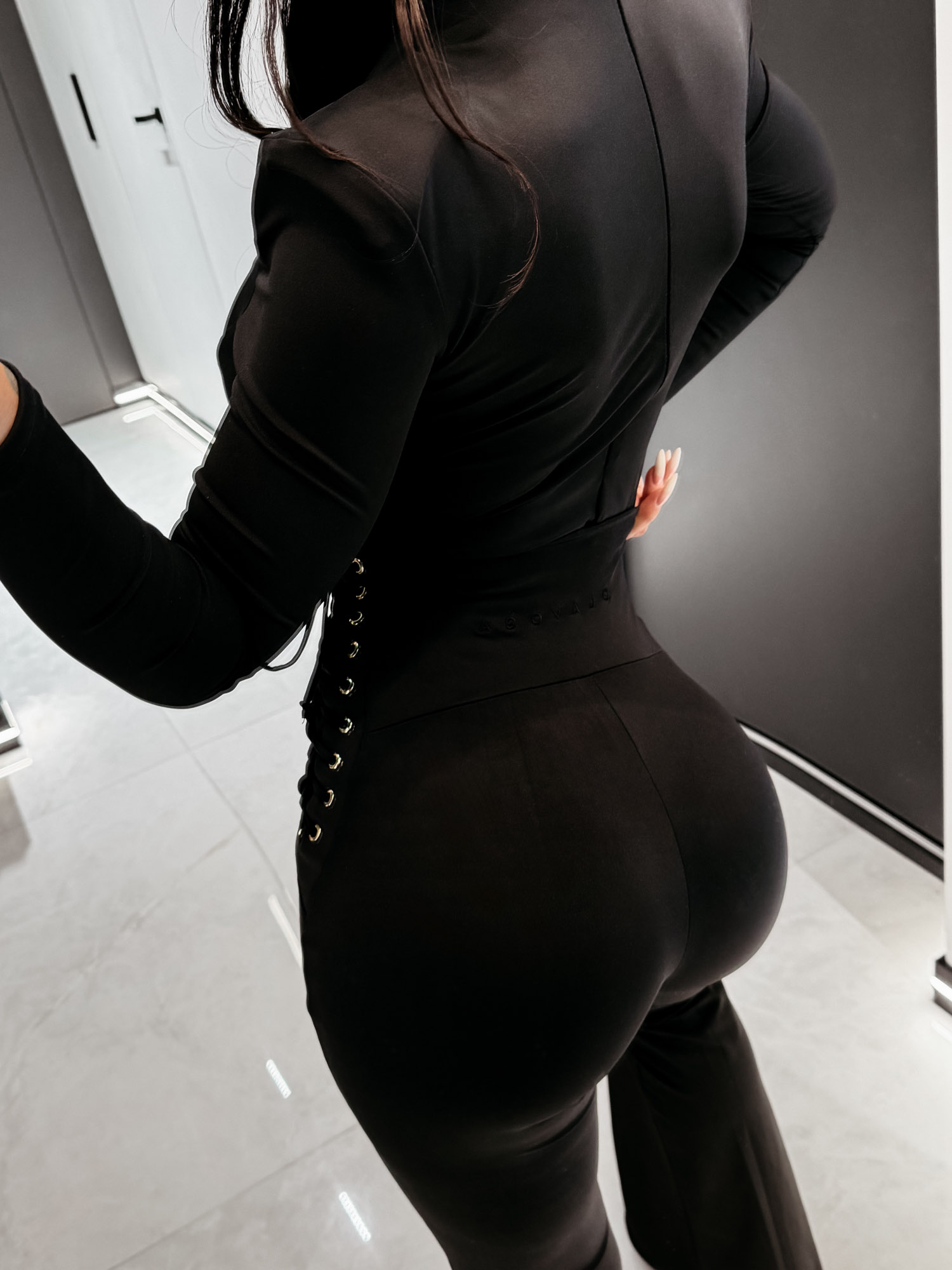 Leggginsy OLAVOGA o przylegający kroju – wysoki stan – nogawka typu flare – boczne wiązania ze złotymi oczkami – modelująca konstrukcja – na tyle subtelne logo w kolorze